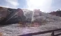 The terrain here is high, and the entire Mammoth Village is nestled in a valley. From afar, the Mammoth Hot Springs are awash in steam. Follow the wooden boardwalk at the foot of the mountain to the Lower Terraces observation deck. From there, continue up the path to the Upper Terraces observation deck at the summit. The ground at the summit is covered in deposits of lime and sulfur, giving it a snowy whiteness, tinged with sulphur and iron.