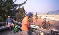 The Mammoth Hot Springs area is a scene of stark contrasts. On one side, pale limestone and withered trees, on the other, vibrant orange water and playful birds. Signs explain that the landscape is constantly changing due to the influence of underground hot springs. One line, "In this rapidly changing landscape, you can glimpse a moment in time," instantly imbues the rough rock with poetry.