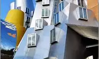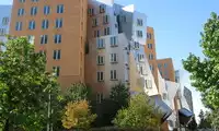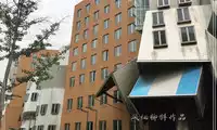 The science and engineering majors that students like me at Jiaotong University aspire to pursue. The most striking building on the MIT campus is a masterpiece by master designer Frank Owen Gehry. At first glance, it looks a bit odd, like a random assemblage of building blocks, a truly spontaneous design. From every angle, the building's sharp, triangular elements are visible, yet it feels as if it's about to collapse. Because of the holiday, we weren't allowed inside the teaching building. It's said to be filled with sculptures and paintings, making it sound more like a modern art gallery.
