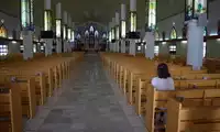 The church is open to visitors, but since it is a weekday, no one is coming to pray.