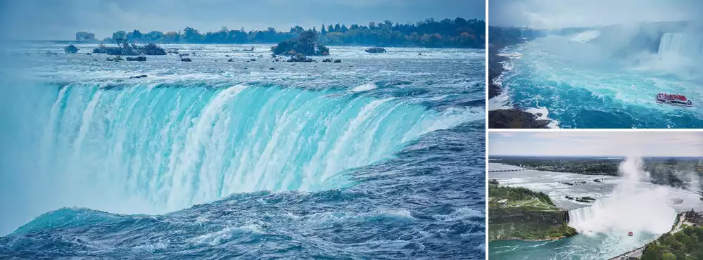 Most of the falls face Canada, offering stunning views from within Canada. Tour options include the Niagara Falls Hornblower Cruise, Whitewater Walk, Niagara Mist Brave Zipline, Behind the Falls Adventure, and Niagara Helicopters. Free raincoats will be distributed on-site for some activities.