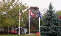 Since then, the two countries have built a sister city called Niagara Falls on each side of the falls, one belonging to Ontario, Canada, and the other to New York State, USA. The two cities are across the river from each other and are connected by the Rainbow Bridge. The flags of the United States, Canada and the United Nations are flying in the center of the bridge, with the Stars and Stripes in the south, the Maple Leaf flag in the north, and the United Nations flag in the middle.