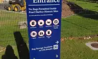 There's no entrance fee to Pearl Harbor (you'll need to purchase additional tickets to visit the memorial or board the submarine). However, bags and camera cases are not permitted. Cell phones, cameras, and small wallets are permitted. If you have a bag you didn't leave in your car, you can check it in at the entrance to the right. It's $5 per bag, I think.