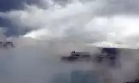There is steam rising from the spring, and its entirety can be seen when there is no wind; when the wind is strong, the water vapor scatters, and the large prism is hidden in the mist.
