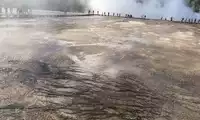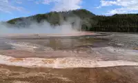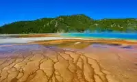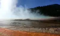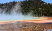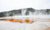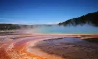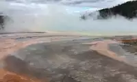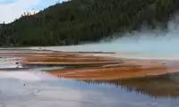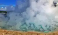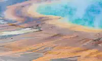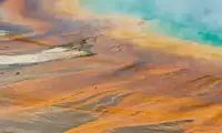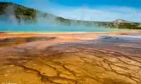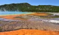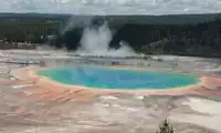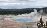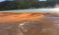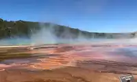 The colors of the Grand Prismatic Spring are breathtaking. Deep blue in the center, lighter blue toward the edges, green at the edges due to algae, then yellow to orange toward the outside, finally edged with red. Its vibrant colors captivate people from around the world, earning it the nickname "Earth's Most Beautiful Surface."