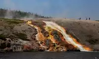 Most people know Yellowstone through photos of the place. I'm no exception. The beauty of the Grand Prismatic Spring lies in the color of the lake. Due to the fluctuations in water temperature, various archaea are able to survive, giving the spring its unique color.