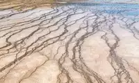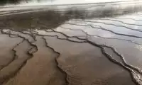 There is a crisscrossing textured landscape between Excelsior Fountain and Grand Prismatic Spring.