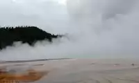 We arrived at the Grand Prismatic, but the fog was so thick it was completely blurry, nothing like the images online. Also, drones aren't allowed in Yellowstone, so from the boardwalk, we couldn't see the entire Grand Prismatic. However, the smaller one next to the Grand Prismatic still had some color variations, created naturally by algae and bacteria. It was truly a marvel of nature.