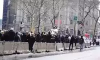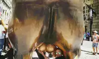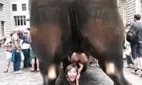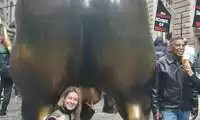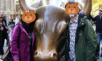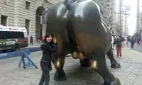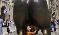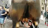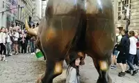 The Wall Street Bull is said to bring good fortune, but you have to touch its balls to get it (covering your face)