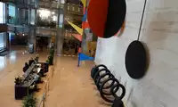 The Wells Building was once the tallest building in the United States. On the wall of the lobby on the ground floor, a huge pendulum swings, colorful pieces tumble, and black circles dance, which is full of artistic tension.