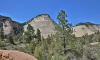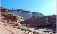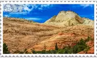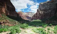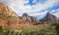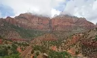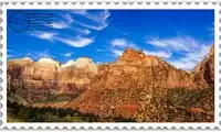 Zion National Park is a national park located in Utah in the southwestern United States. The primary attraction of this 229-square-mile national park is Zion Canyon, a 15-mile-long, half-mile-deep canyon of red and tan Navajo sandstone cut by the North Branch of the Virgin River. Other notable features include the Great White Throne, the Checkerboard Range, Kolob Arch, Three Fathers, and Virgin Pass.