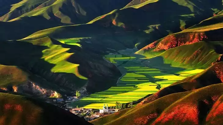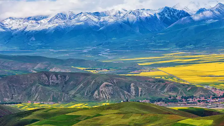 Menyuan rapeseed flowers are found in Menyuan County, Haibei Tibetan Autonomous Prefecture, Qinghai Province. Known as the birthplace of rapeseed in northern China, it boasts the largest rapeseed cultivation area in China, and perhaps even the world, covering 500,000 mu (approximately 1,000 hectares). Stretching for dozens of kilometers, the area stretches from Qingshizui on the Haomen River in the west to Yulongtan on the Datong River in the east, from Lenglongling on the border with Gansu Province in the north to the towering Daban Mountain in the south.