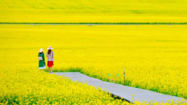 The fields are accessible year-round, but the peak time to visit is late June to July when the rapeseed flowers are in full bloom. Spring and early autumn offer milder weather and fewer crowds.