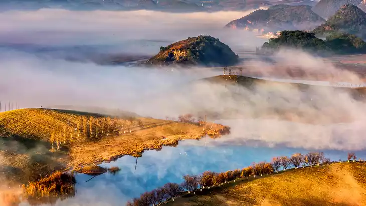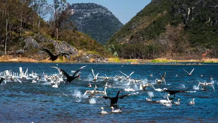 June to September is Puzhehei's prime tourist season. Over 60,000 mu (approximately 1,000 acres) of red and white lotus blossom in the water, creating a dazzling spectacle. Puzhehei also has its own unique charm during the off-season, attracting arty types who enjoy the scenic views while strolling along the lakeside and mountain paths, DSLR in hand.