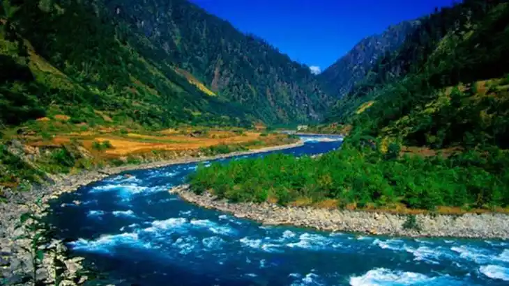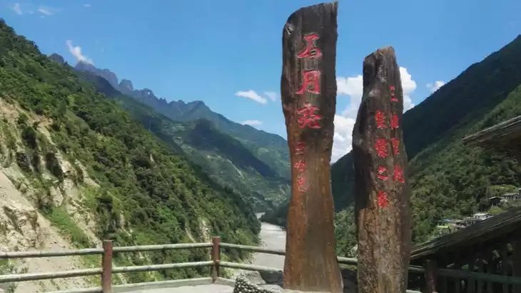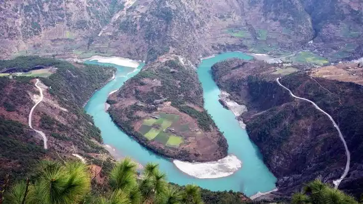 The Nujiang River flows through the vicinity of Ridan Village in Bingzhongluo Township. Blocked by the Wangqing cliffs, the river changes its direction from north to south to east to west. After flowing for more than 300 meters, it is blocked by the Dala Mountains and turns sharply from west to east again, thus forming a large semicircular bay, which is the first bay of the Nujiang River.