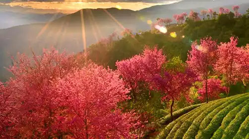 Located in Nanjian County, Dali, Wuliangshan Cherry Blossom Valley is in full bloom from late November to December each year. The winter cherry blossoms planted in tea gardens bloom in full bloom, creating a fairyland on earth. The Cherry Blossom Valley covers approximately 2,000 mu (approximately 1,000 mu) and is divided into three sections, designated Scenic Areas 1, 2, and 3. Scenic Area 3 is dominated by Rhododendron azaleas, which bloom in March.