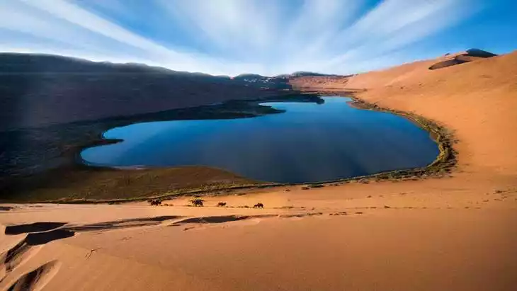 Badan Lake, located on the southern edge of the Badain Jaran Desert in Inner Mongolia, serves as the gateway to the region. The Badan Lake complex covers approximately 10 square kilometers and comprises 13 lakes, one of which is a rare freshwater lake in the desert. The scenic area is dotted with sand dunes and peaks, each offering a unique spectacle. Here, the sound of singing sand gathers in clusters, creating a unique sound. Verdant grass and lush trees border the lake, creating a unique "South of the Yangtze River in the Northern Desert" scene. Towering sand dunes, the vibrant singing sand, the tranquil lakes, the lush wetlands, the dreamlike reflections, and the honest and simple camels imbue this "sea of death" with new life.