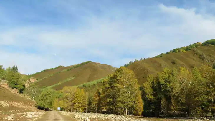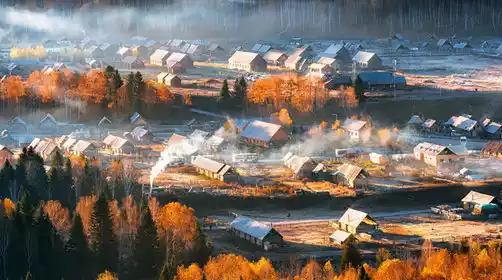 This small village, with hundreds of households and a population of over a thousand, is said to be home to descendants of Genghis Khan, whose livelihood is primarily nomadic. The idyllic village is situated on a flat plain surrounded by mountains, with rows of poplar and birch trees lining its perimeter. From the hillsides surrounding Hemu Village, one can overlook the village and the Hemu River: ghostly valleys, flowing water over small bridges, and horse herders shuffling through the forest. Hemu Village is most famous for its breathtaking autumn colors, with the mountains ablaze in crimson. Smoke from cooking rises amidst the autumn hues, forming a dreamy haze that resembles a fairyland.