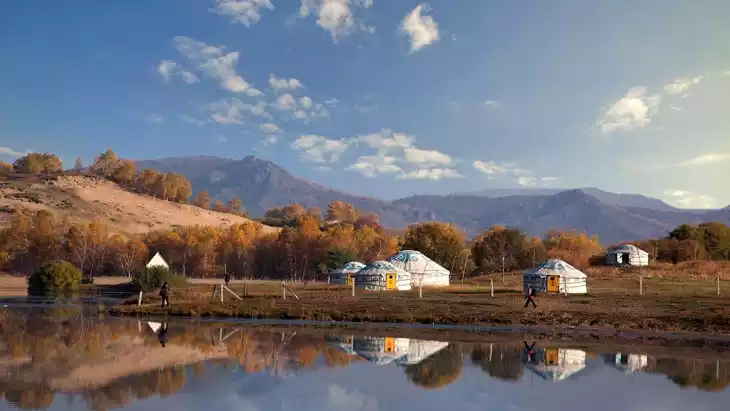 Ulan Butong is covered with golden color. In the birch forest after autumn, the golden leaves set off the white trunks. The yellow grassland is piled with hay stacks sorted by herdsmen. The autumn air is clear and refreshing.