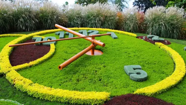 A famous attraction in Geneva, Switzerland is known as the "Garden Country" and the "Home of Watches." Even more remarkable is the way Swiss artisans have seamlessly combined the beauty of flowers with the craftsmanship of watchmaking to create the ingenious "Flower Clock." Gardeners planted different flowers with the seasons, creating a large clock displaying varying colors and even patterns. Whether in sunshine or in the elements, the clock remains accurate. With a circumference of 15.70 meters and a diameter of 5 meters, its second hand measures 2.5 meters, with the seconds ticking 27 centimeters apart, making it the world's longest second hand of any plant-based clock.