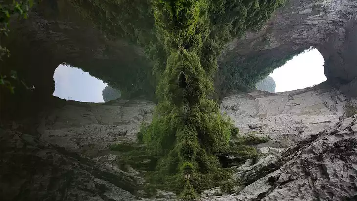 The Water Curtain Cave, located directly in front of Huangguoshu Waterfall, resembles a long dragon lying behind the cascade. Visitors can reach out from behind the waterfall and touch the cascading water, a truly unique experience. The unique perspective of the cave, peering through the cascade and gazing at the surrounding scenery, is a truly remarkable and breathtaking feature of Huangguoshu Waterfall.