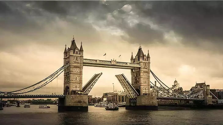 Tower Bridge is the first bridge crossing the Thames Estuary in London, England, and the most famous of the 15 bridges crossing the Thames. It is a symbol of London and is known as the "front door to London." Tower Bridge frequently appears in documentaries and films about London.