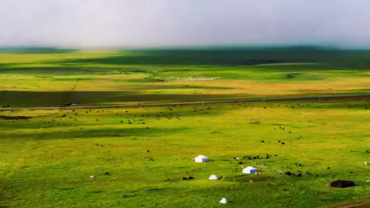 - Wide-open grasslands with grazing yaks at sunrise or sunset.