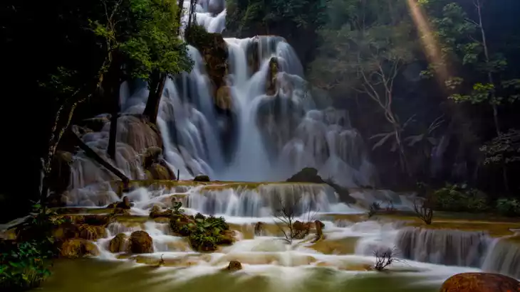 The multi-layered and wide waterfalls clear away the heat of Laos
