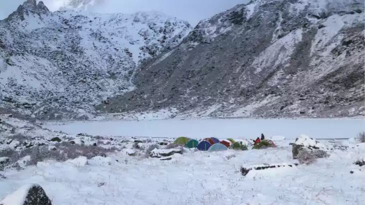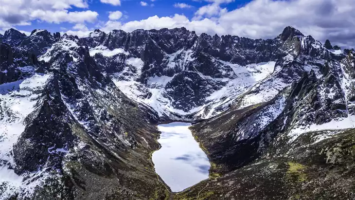 "Zhagacuo" is Zhaga Lake, located 14.5 kilometers from the main highway and 54.5 kilometers from the county seat. Three or four kilometers from Zhagacuo, several vast U-shaped valleys and majestic glacial peaks come into view, shrouded in mist. Thick fog rises from the towering rock peaks, resembling erupting craters and beacon towers. Zhagacuo's surface is frozen in time, its rock walls capped with white snow. At an altitude of 4,600 meters and covering approximately 0.6 square kilometers, it is the highest of the four famous lakes in Aba County. The lake's waters are tranquil and serene, with fish swimming around. A unique, small, fat fish called "big-bellied" fish resides within the lake.