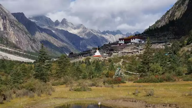 The entire village is situated on a flat, open area midway up a hillside on the east bank of the Xiaojin River. Sheltered at the foot of the renowned Merduo Mountain in the Jiarong Tibetan area, the tranquil countryside and the beautiful Tibetan watchtowers complement each other, earning it the reputation of "the most beautiful ancient Tibetan village."