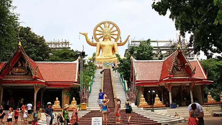 Near the tropical airport on Koh Samui, there's a large golden Buddha statue perched on a raised platform. Facing the green hills and backed by the boundless sea, the statue is a great spot to admire the sunset.