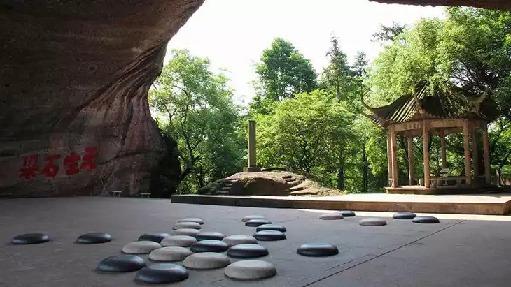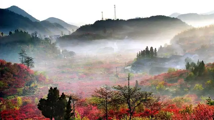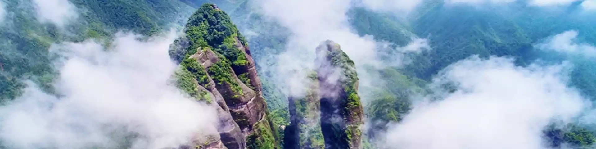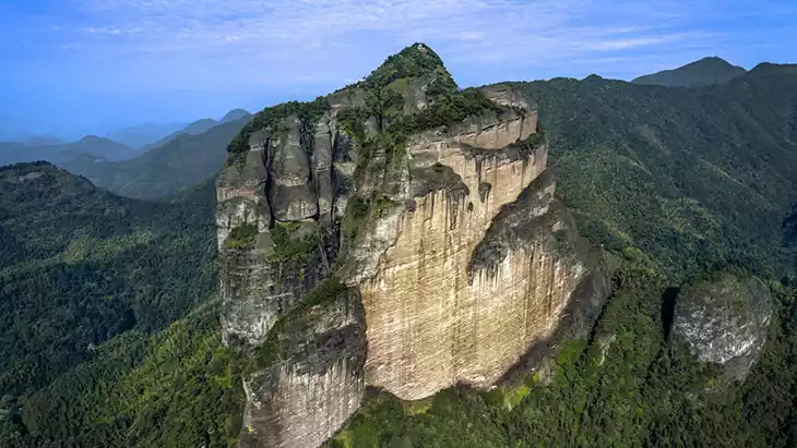 Jianglang Mountain is located in Shimen Town, Jiangshan City, Quzhou City, Zhejiang Province. It consists of six parts: Three Stone Peaks, Eighteen Bends, Tashan, Xunu Lake, Xianju Temple and the entrance area. It is mainly characterized by "Strange Peaks and Red Cliffs" and is famous for the majestic and peculiar "Three Pieces of Stone". It has the first strangest peak of China's Danxia, the largest one-line sky in the country, the naturally created Great Man Peak, the thrilling and steep Langfeng Tianyou, the thousand-year-old Kaiming Zen Temple, the thousand-year-old Jianglang Academy, the largest cliff carving in the country with Mao Zedong's handwriting "The Countryside Is So Beautiful", "Yanxia Pavilion" and more than 100 other scenic spots and landscapes.