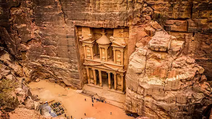 The Al Khazneh Temple is a 2,000-year-old temple in the ancient city of Petra. Local Bedouins believe that there is a treasure hidden at the top, so the temple is commonly known as the "Treasure House."