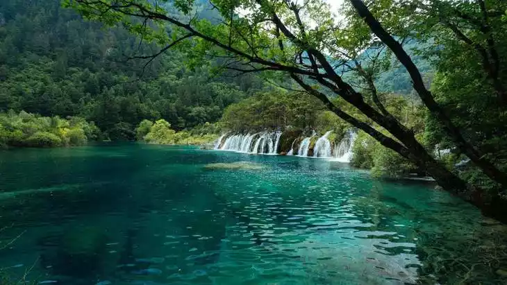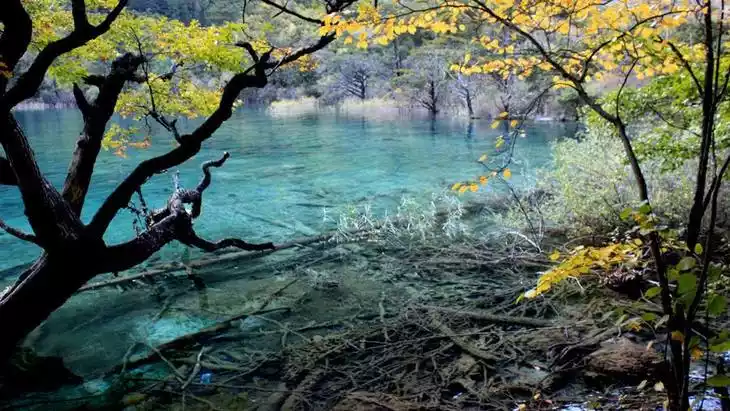 Huohua Lake, also known as the Sparkling Pool, stands at an altitude of 2,187 meters and is nine meters deep. Located between Shuanglong Lake and Wolong Lake in Jiuzhaigou, Aba Prefecture, Sichuan Province, its azure waters are as smooth as a mirror. Surrounded by lush forests, the lake's waters are shrouded in a blanket of emerald green, resembling a shimmering emerald. As the morning mist dissipates and the dawn breaks, the sunlight refracts, creating a scene of flaming sparks, dotting the surface with sparkling, sparkling stars. Hence the name Huohua Lake. If Jiuzhaigou resembles a "Y," Huohua Lake would be the upper half of the vertical line.