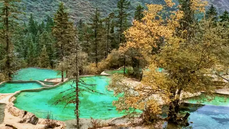 Xishen Cave itself is a travertine stream cascading down from the Golden Beach. Here, it suddenly collapses, forming a 10-meter-high and 40-meter-wide travertine wall. It is currently the longest travertine wall in the world. The rushing water flows over the embankment and cascades down the travertine wall into a magnificent golden waterfall, which is a very spectacular sight. It is a key attraction in the Huanglong Scenic Area.