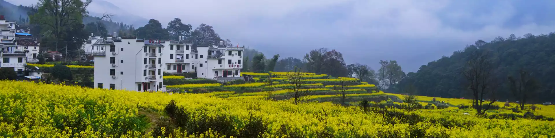 From March to April, the terraced fields are covered with golden rapeseed flowers. Jiangling Village is the best place to see them in Wuyuan. The rapeseed flowers complement the Hui-style dwellings, creating a beautiful pastoral landscape.