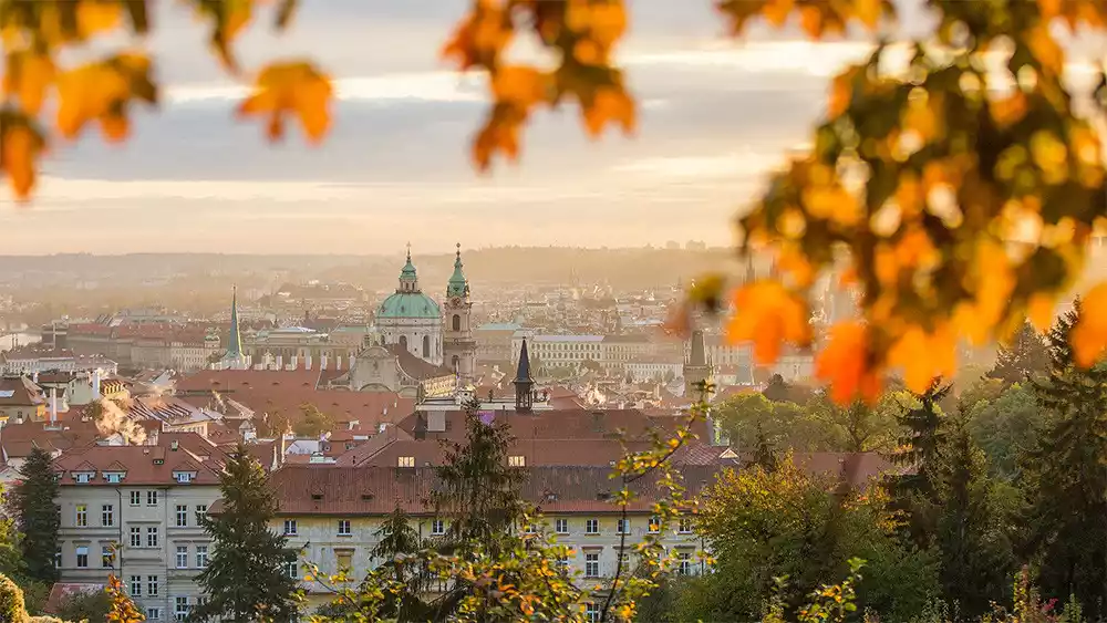 Prague is a beautiful, ancient hill town boasting numerous buildings spanning various historical periods and styles, with Baroque and Gothic architecture predominating. The overall impression of Prague's architecture is characterized by its rich and vibrant rooftops, resulting in its reputation as "one of Europe's most beautiful cities." Its towering spires, forming a towering forest, have earned it the nickname "the City of a Thousand Towers." In the sunlight, these towers appear resplendent, earning Prague the nickname "Golden Prague." Autumn intensifies the golden hue.