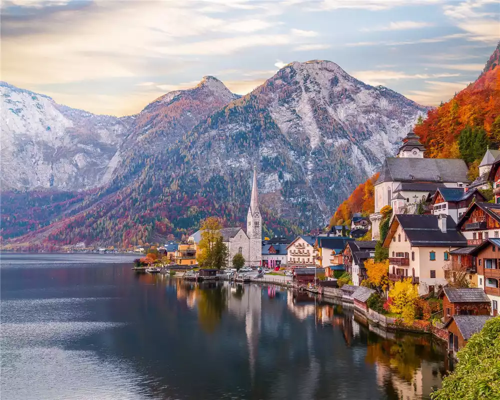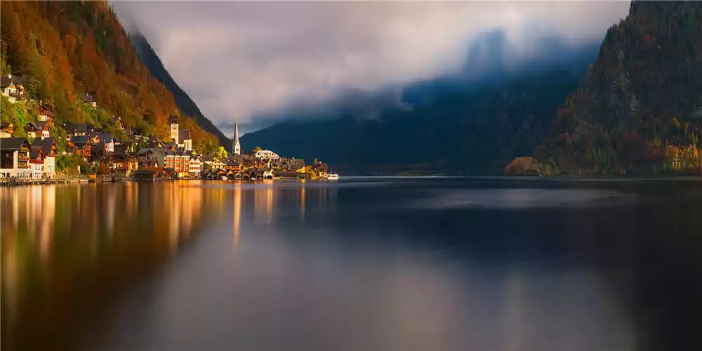Compared to summer, Hallstatt in autumn is truly captivating. The distant mountains, whipped by the autumn wind, transform into a vibrant hue of red, yellow, and green. I've seen this postcard angle countless times online, and I never tire of it. From dusk to dawn, I spent over four hours in the freezing cold, feeling incredibly energized, yet I still couldn't get enough. I quietly watched Hallstatt awaken from her slumber. Such beauty is irresistible; I couldn't miss even a second.