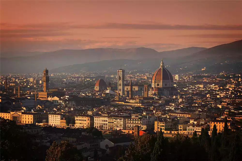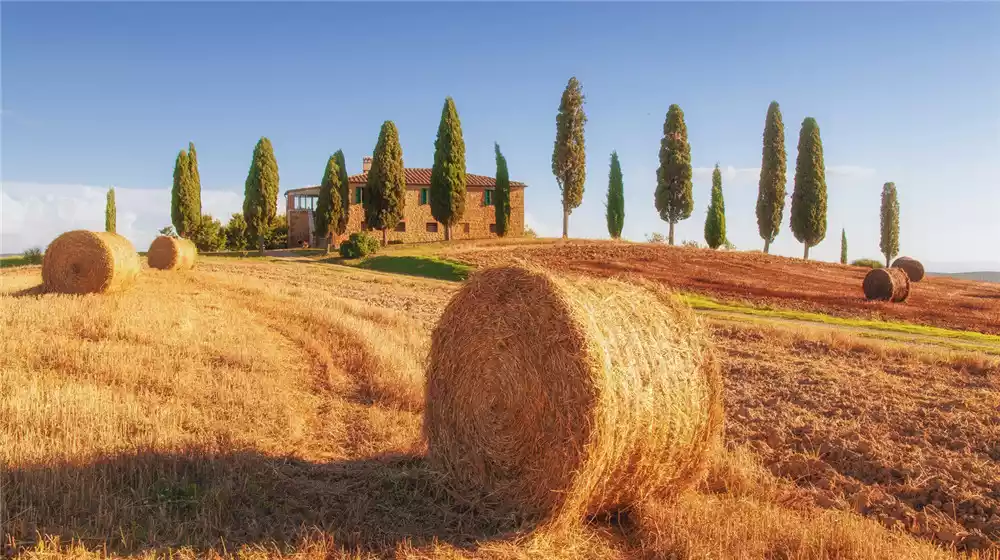 The Val d'Orcia, a gently rolling, well-cultivated hilly region, boasts not only a rich cultural heritage but also a unique landscape dotted with towns and villages. The valley, fields, towns, and villages create a breathtakingly beautiful landscape. In autumn, the mountains are ablaze with vibrant foliage, with towering bell towers occasionally peeked through the withered branches on the mountaintops. Villages lined with red roofs can be seen beneath the mountain smoke, creating a scene that is truly captivating.