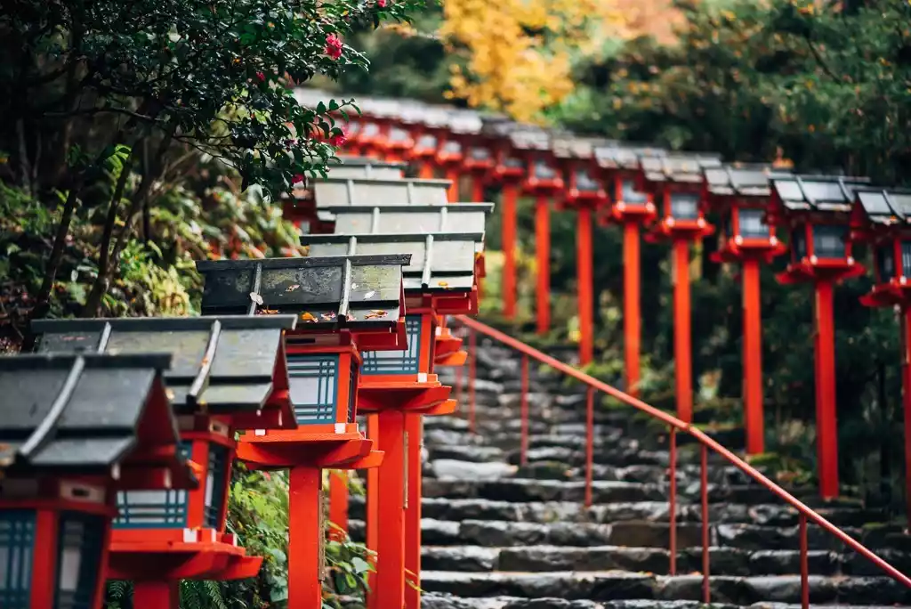 Most people know Kifune Shrine for its renowned ryusui somen noodles, a popular summer escape. However, few realize that this shrine, dedicated to the guardian deity of mountains, forests, and water, also boasts a stunning autumn maple scene. Ascending the steps, accompanied by crimson lacquer lanterns, you'll be greeted by falling maple leaves and the vibrant colors of autumn.
