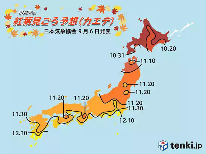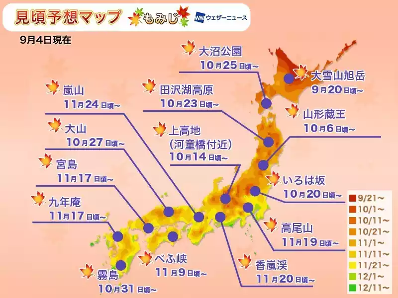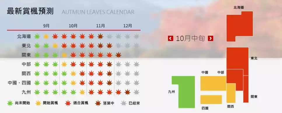 At the end of September, people begin to look out for "fall foliage information." Because the Japanese archipelago is long and narrow, autumn arrives in late September, with the maples first beginning to turn red in northernmost Hokkaido. As the colder air moves south, maple trees in the Kanto, Kinki, and Kyushu regions begin to take on their vibrant colors. In the central region, the leaves bloom from late October to mid-November, while in Kyushu, they don't begin to reach full bloom until early December. By early December, the leaves have all fallen, marking the so-called "fall foliage front."