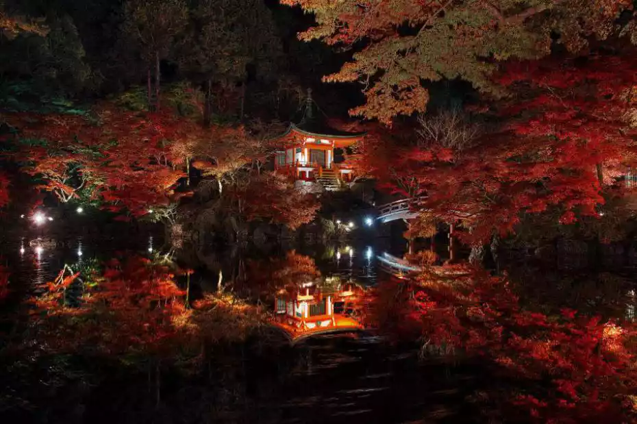Autumn is the most captivating season at Daigo-ji Temple. The vibrant crimson leaves, the delightful crimson corridor, and the Sanbo-in Temple, all captivating visitors, are enough to captivate them. The temple courtyard, with its flowing water and small bridges, is nestled against a backdrop of verdant mountains, and its fiery red maples.