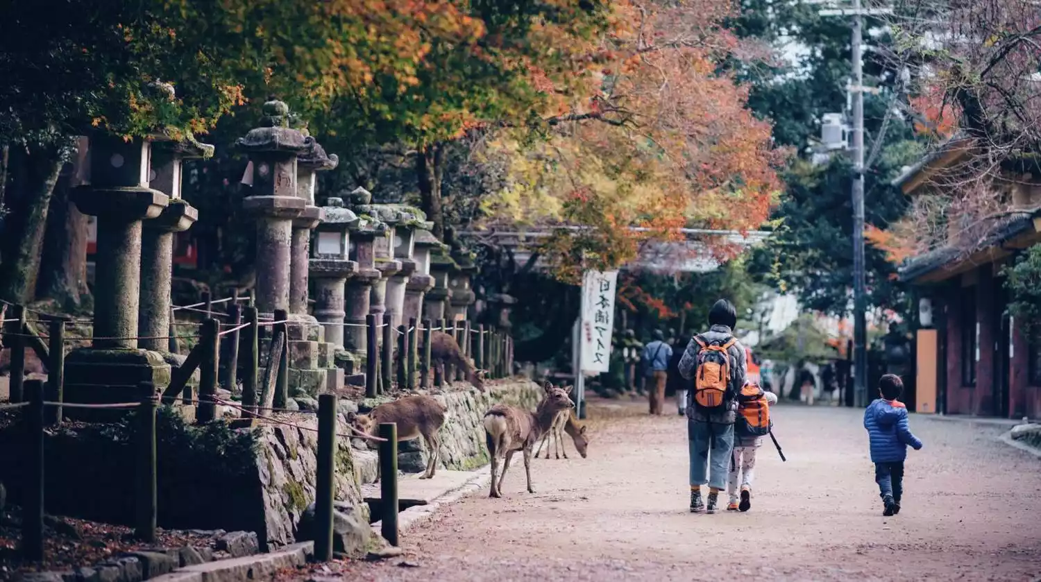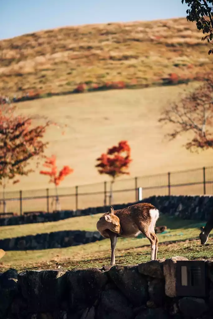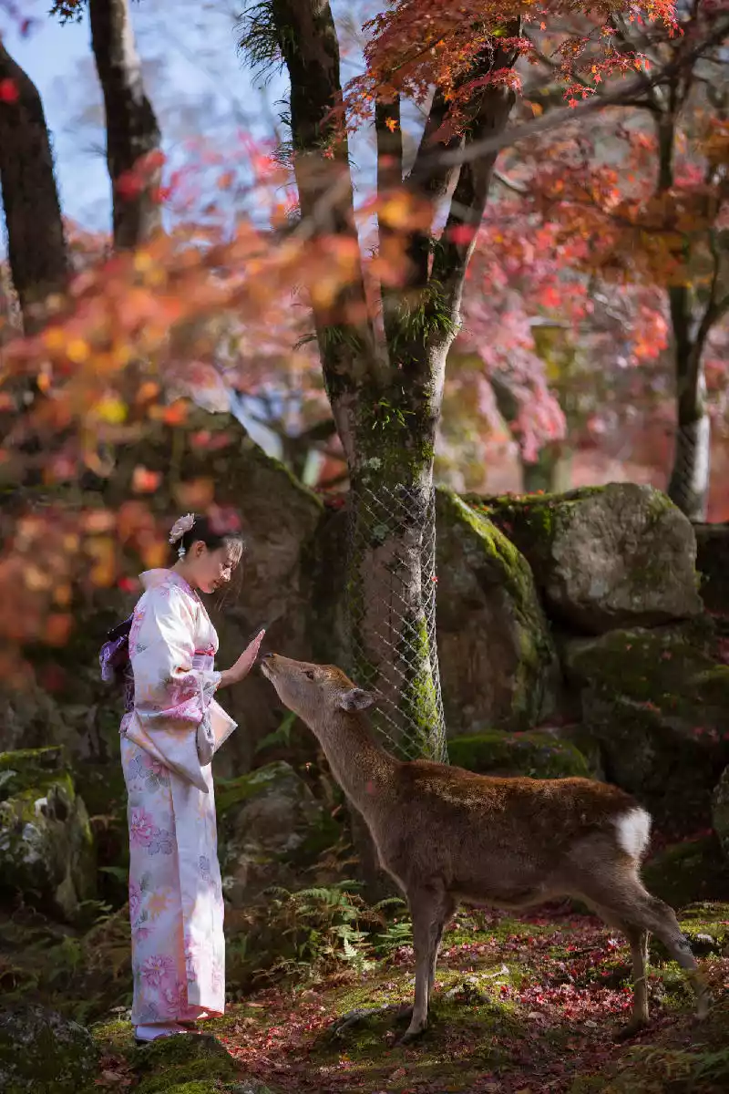 "Deer call, feasting on wild apples." Besides the adorable deer, Nara also boasts countless crimson leaves and ginkgo trees in autumn. Amidst the vibrant hues of crimson and gold, you can vaguely see temple roofs, carefree deer, and swaying rivers. The sun gently streams down, creating a truly enchanting autumn atmosphere.