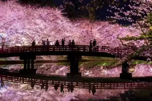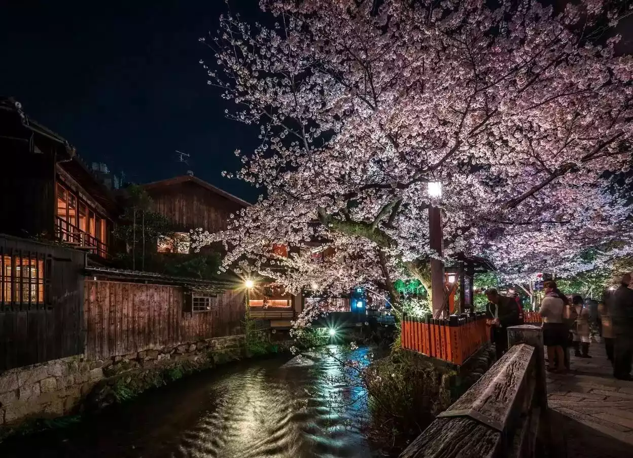 As night falls, the red lights lining the riverbank illuminate. The cherry blossoms, shrouded in the night, appear especially delicate and sweet. Strolling along the riverbank, shops line the banks, stalls selling a variety of snacks and fine wines. Under the bright moonlight, accompanied by the fragrance of flowers, people recount the beauty of the world.