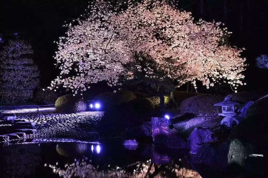The park's most famous weeping cherry tree, over 200 years old, has been known as the "Gion Night Cherry Blossoms" since the Meiji era. During the hanami period, this graceful tree is illuminated after dusk, emitting a soft halo of light. The cherry blossom branches, like a giant fan, are outlined in a dreamlike scene. Walking through it, you can faintly smell the subtle fragrance, which makes you hold your breath in admiration!