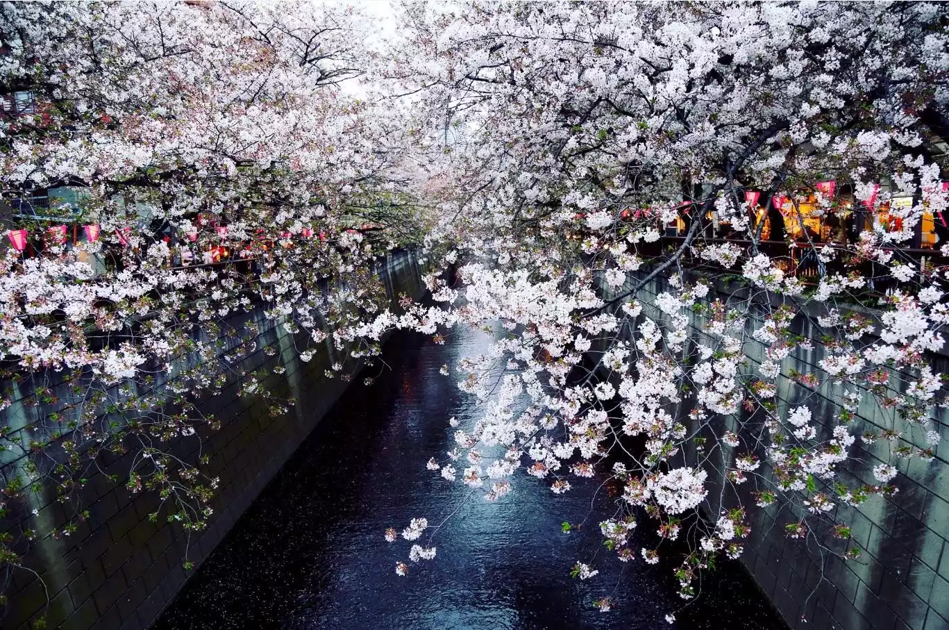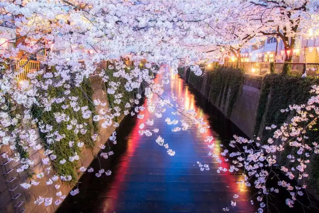 Meguro River's night cherry blossoms are the perfect spot for viewing the "night cherry blossoms." In April, the cherry blossoms begin to bloom, clusters of pink cluster together in a joyful and lively atmosphere. An occasional breeze blows, petals fluttering in the wind, petals falling onto the river surface in a vibrant display of color, the blossoms drifting and the water flowing freely.