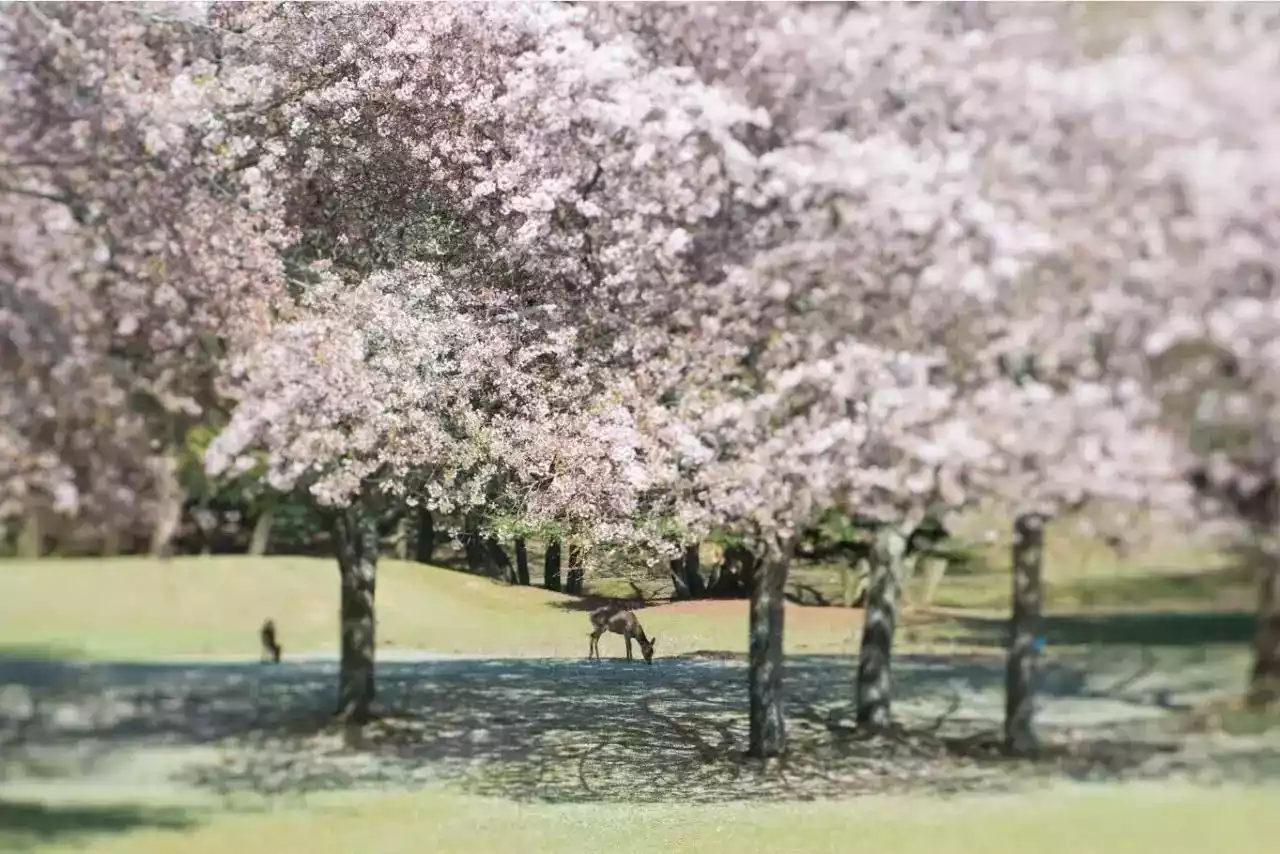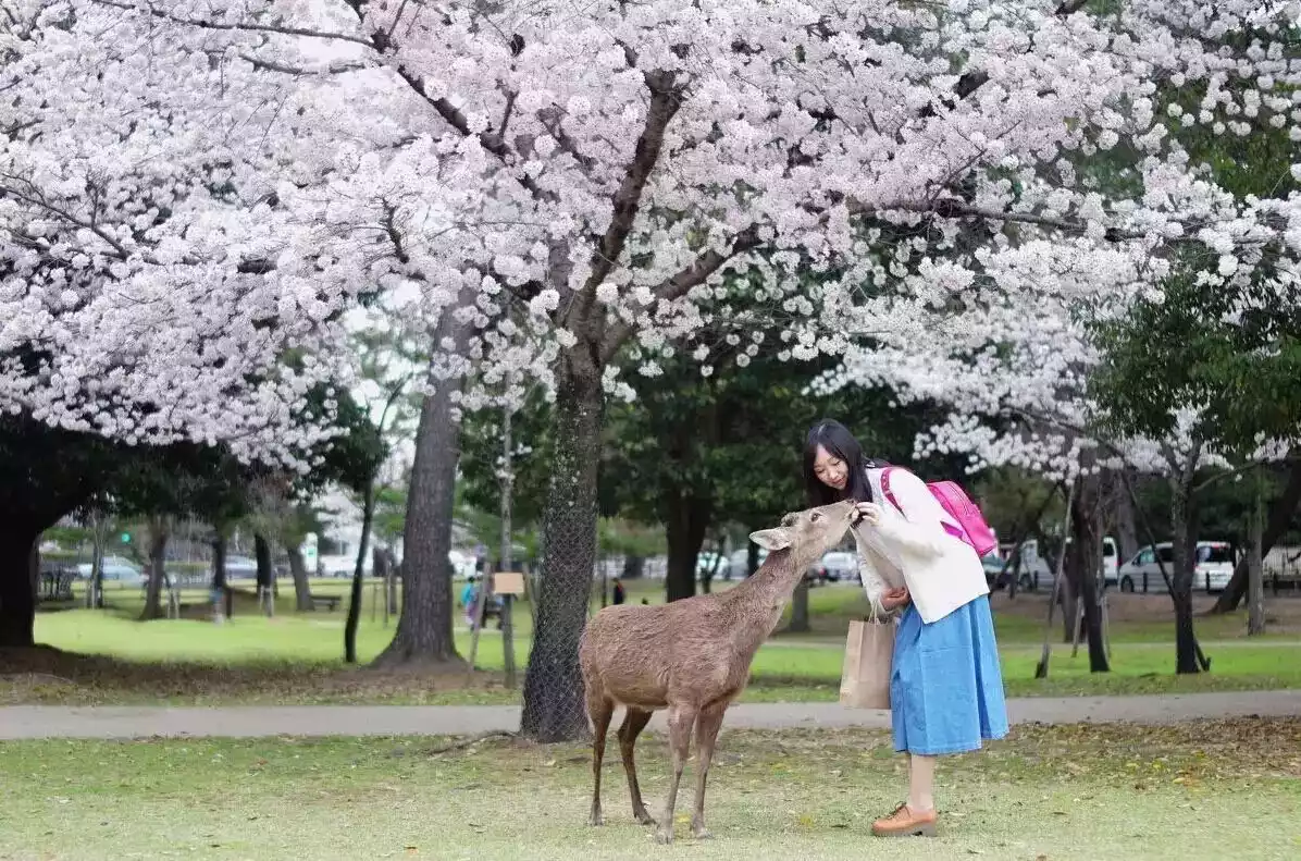 Nara, Japan, is an ancient cultural city boasting numerous ancient temples, shrines, and historical relics. Hundreds of wild sika deer live on the vast meadows of Nara Park. The deer are delightful to behold, quietly foraging for food, frolicking with one another, or even approaching you to bend down and rub against you.