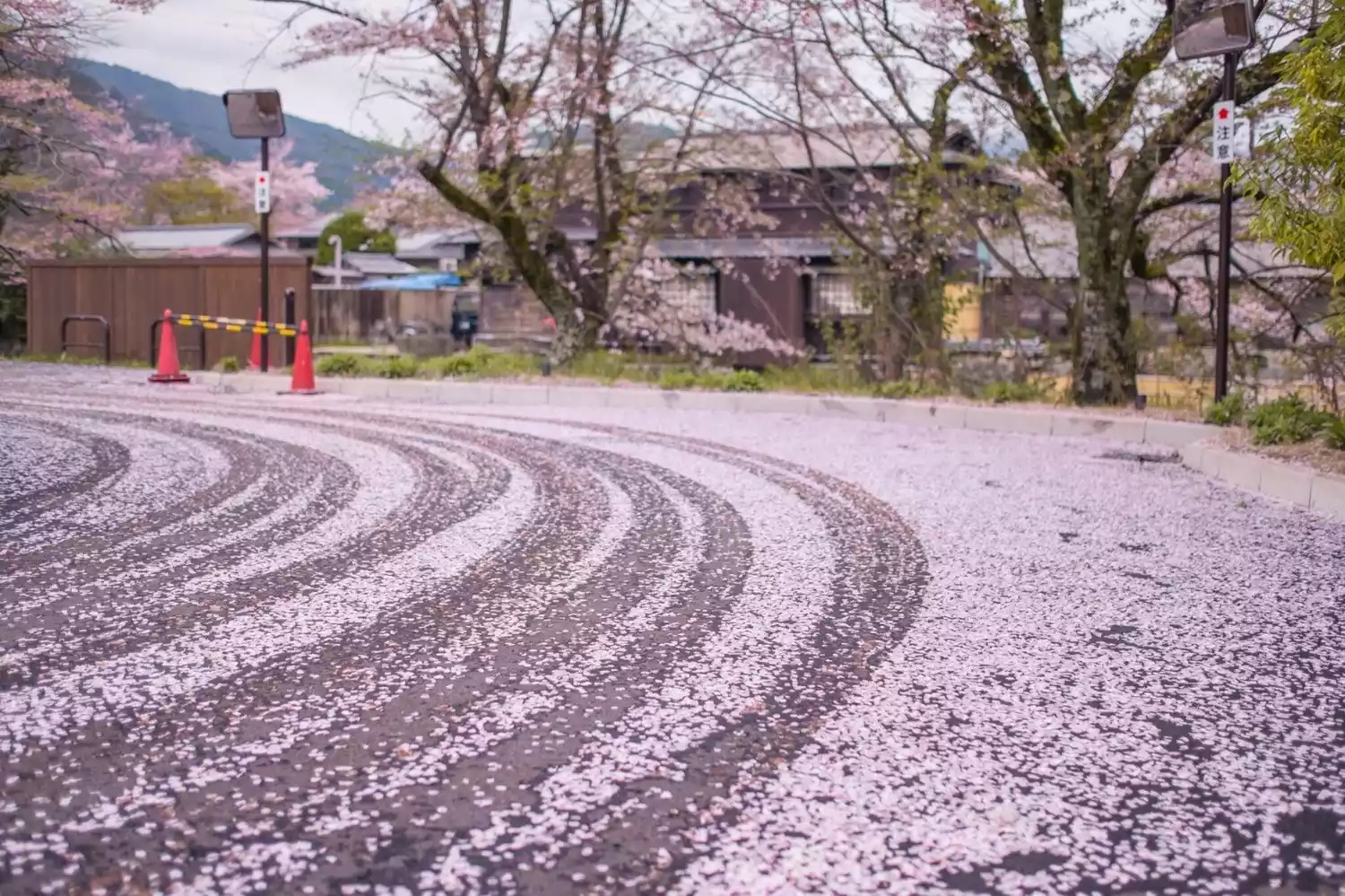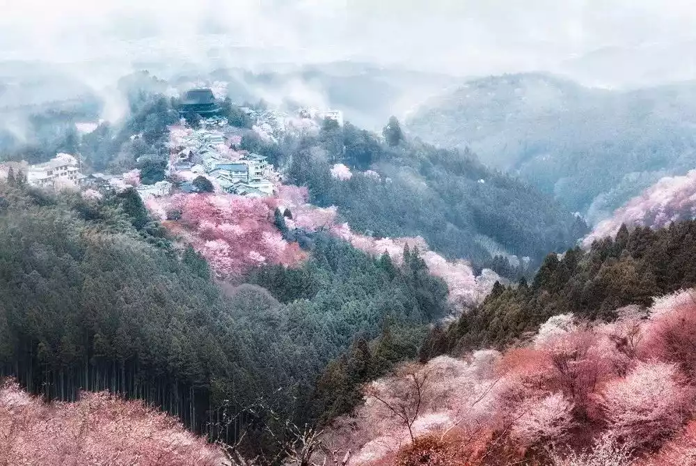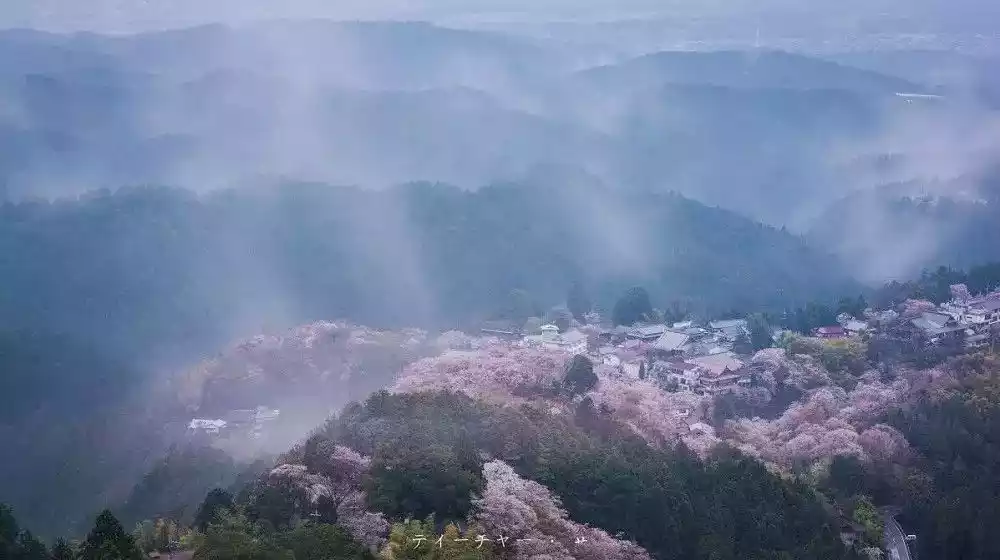 Every spring, tens of thousands of cherry trees bloom across Mount Yoshino, creating a scene known as the "Yoshino Thousand Cherry Blossoms." From early to mid-April, the vibrant blossoms blanket the mountain in breathtaking beauty, transforming Mount Yoshino into a sea of pink petals. The gusting winds between the peaks swirl the petals into a dazzling display of falling blossoms, bathing the mountain in a sea of cherry blossoms, which drift down in a shower of petals in the crisp air.