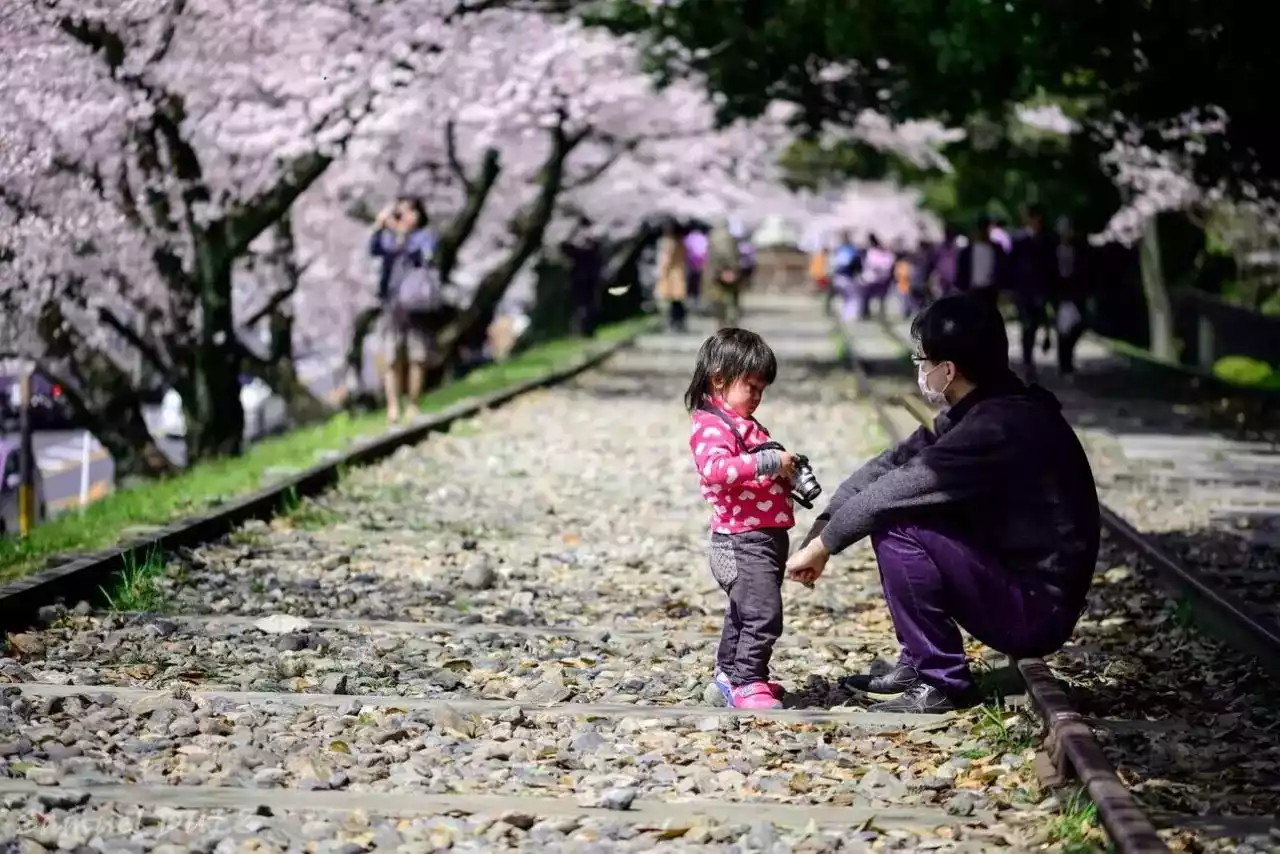 Cherry blossoms line both sides of the railway. Together, the train tracks and the cherry blossoms look like something out of a cartoon. Standing on the bridge at the end, the view from the bridge, shaded by the flowers, is truly breathtaking.