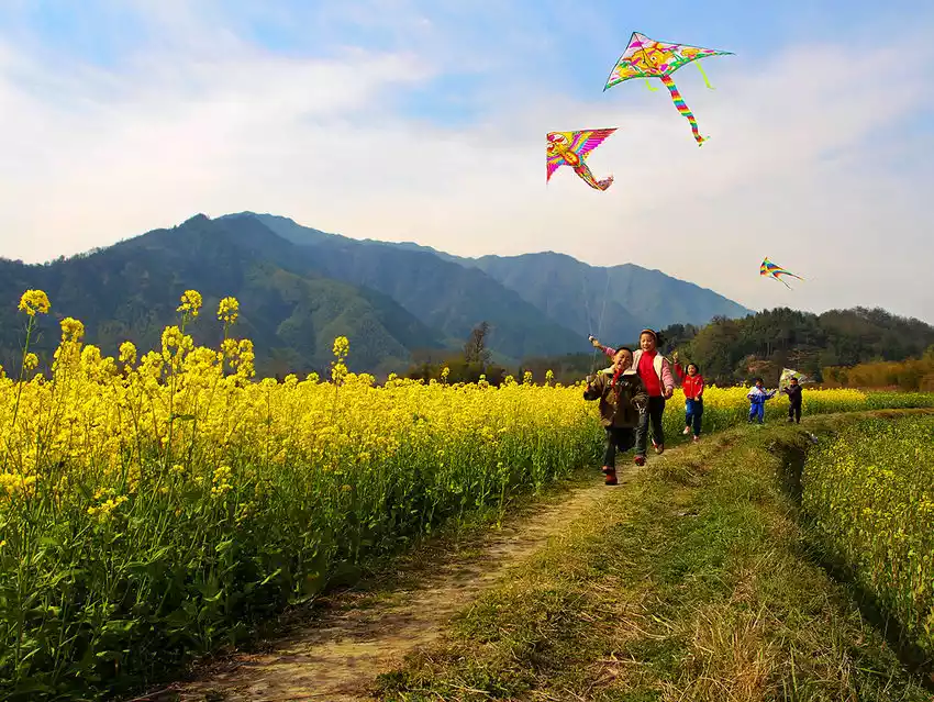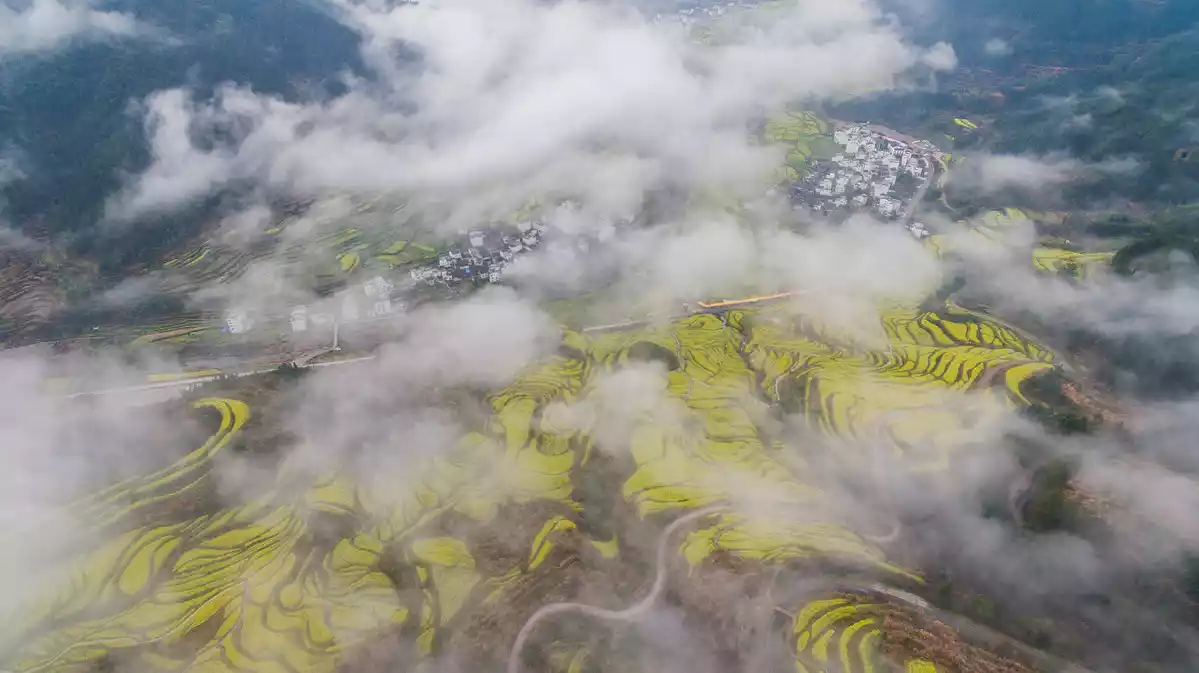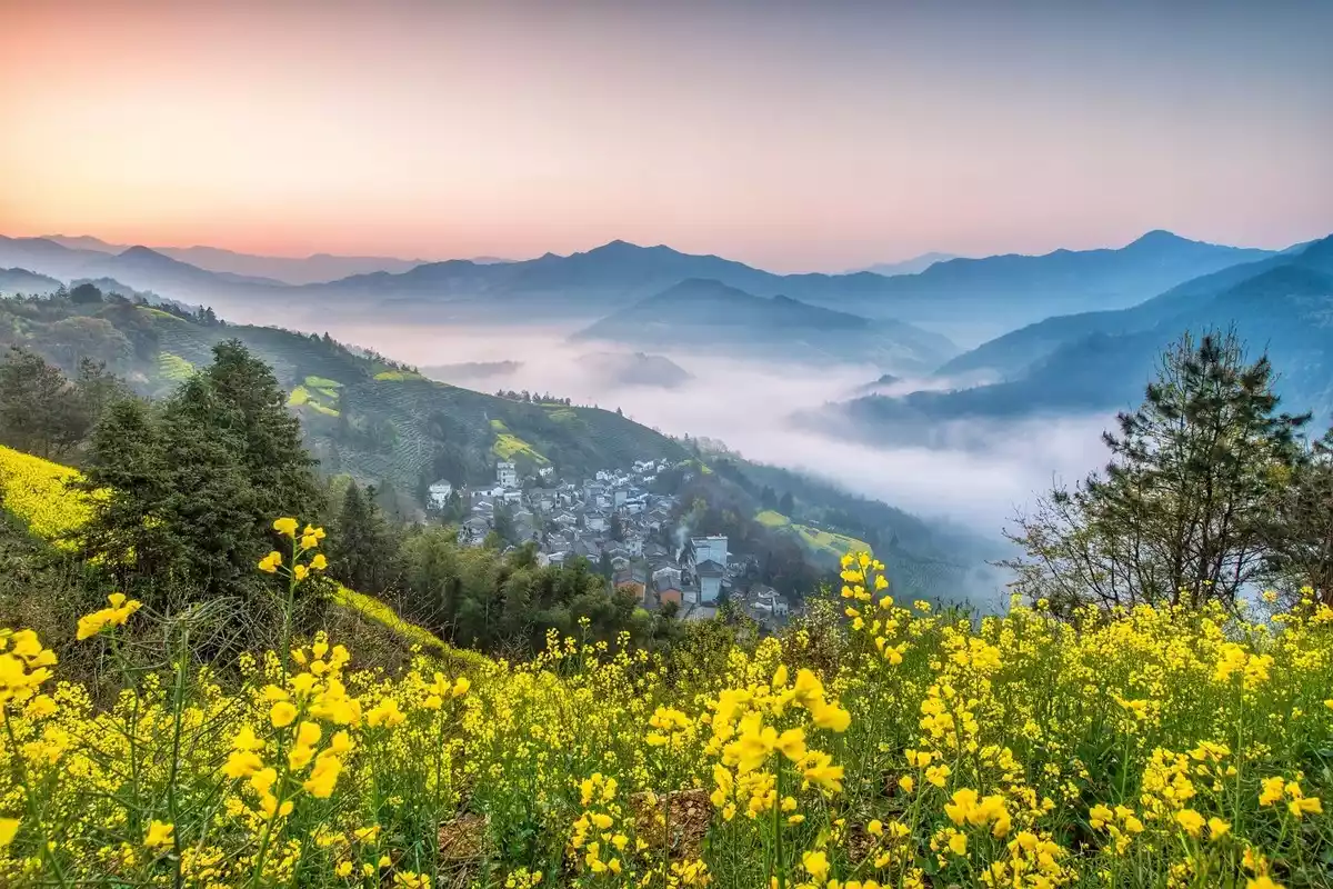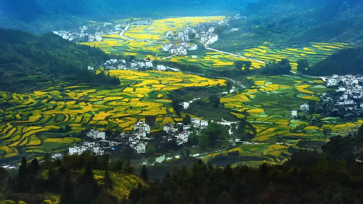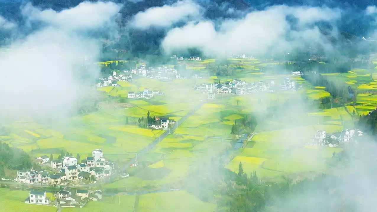 It's rapeseed season in Kecun Township, Yi County, southern Anhui's largest rapeseed basin. Standing on the observation deck at Maoshanling, you're struck by the vast printmaking before you: a smudge of yellow, shrouded in green, with pink walls and black tiles scattered across the landscape, appearing only indistinctly. Kecun is also a new filming location!